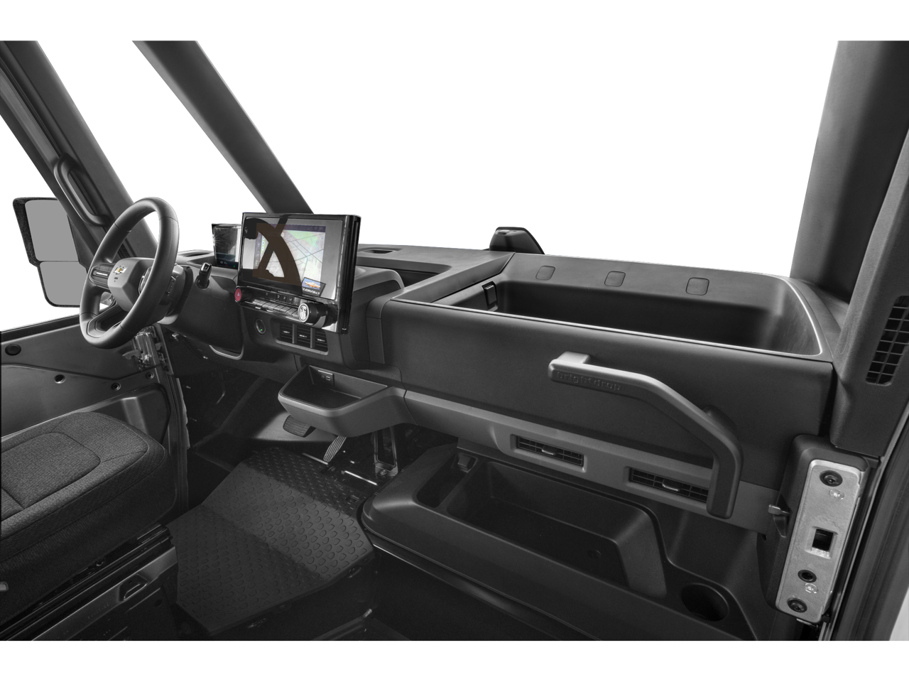 - Storage bins upper instrument panel on driver side, upper instrument panel on curbside, lower floor area on curbside
